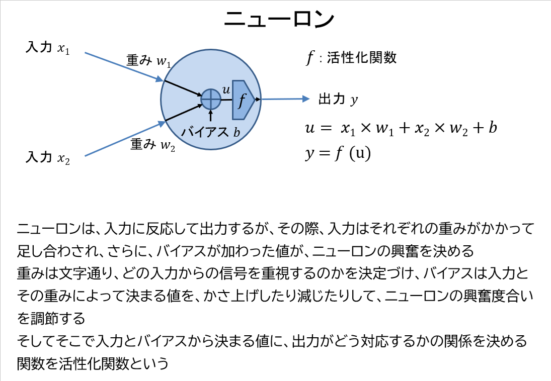ニューロンは人間を含む生物の神経細胞の働きを、簡略化して数値計算できるようにしたもの、と言えば良いかと思います。