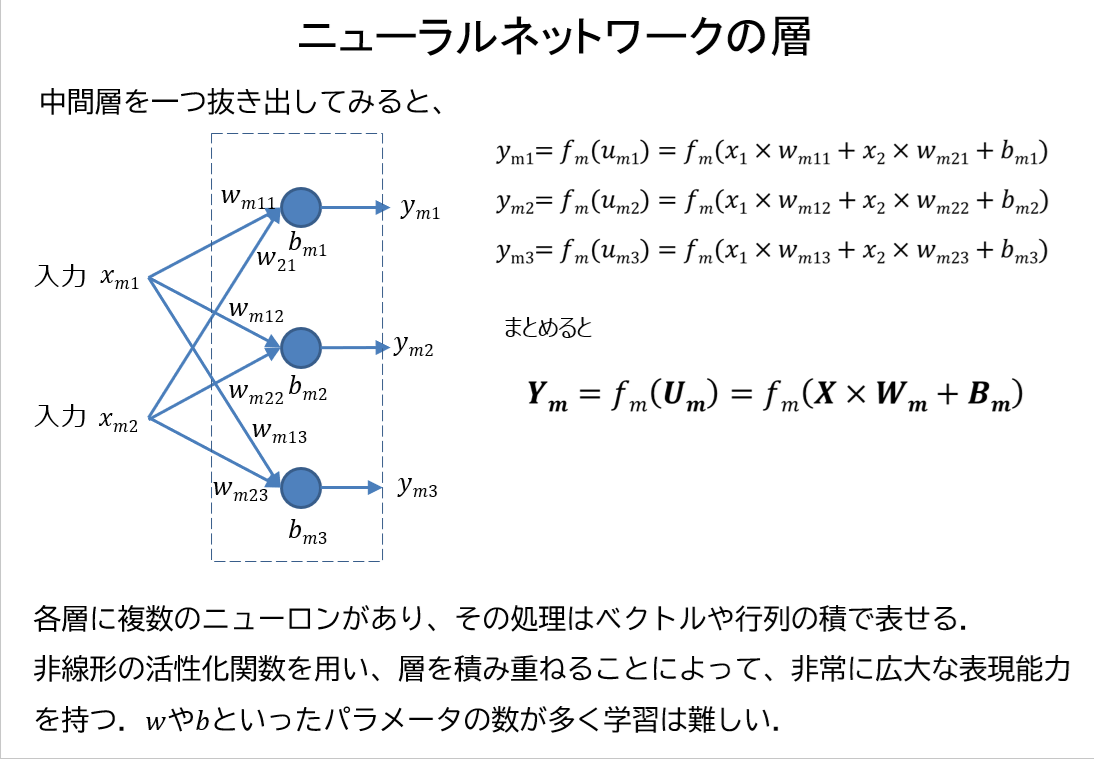 そしてこの複数入力を同時に複数ニューロンに入れて処理するものを「層」と呼びます。この様子を説明する図がありますので、以下に掲載します。